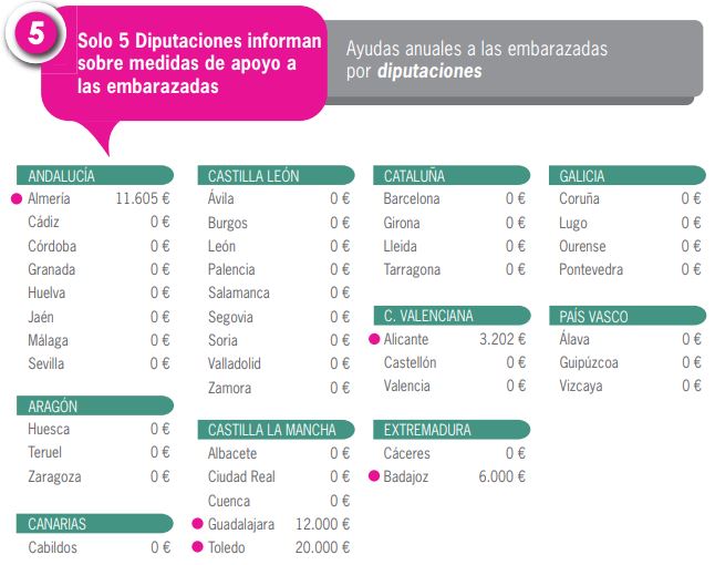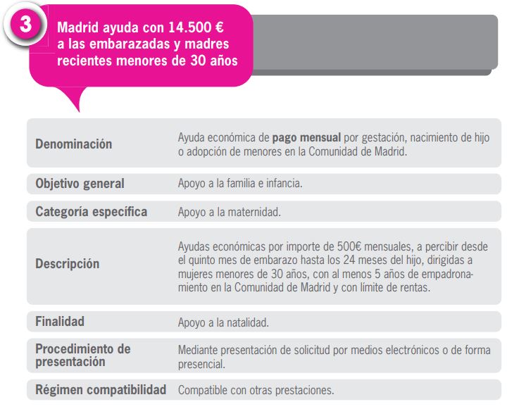 El objetivo de este informe es doble: por un lado, trata de identificar y recopilar las ayudas a la maternidad que ofrecen las Administraciones Públicas (autonómica y local) a las mujeres embarazadas con independencia de si son o no trabajadoras. Estas últimas reciben prestaciones y ayudas por ser trabajadoras: prestaciones por baja de maternidad, reducción de jornada para lactancia, 100 euros para madres trabajadoras, subsidio en caso de parto múltiple, adopción, deducciones fiscales para familias numerosas y madres trabajadoras y deducciones del IRPF, pero hay una parte de mujeres que dan a luz, una de cada tres, que no están trabajando ni cobrando la prestación de desempleo que no tienen derecho a la prestación por nacimiento y cuidado del menor.