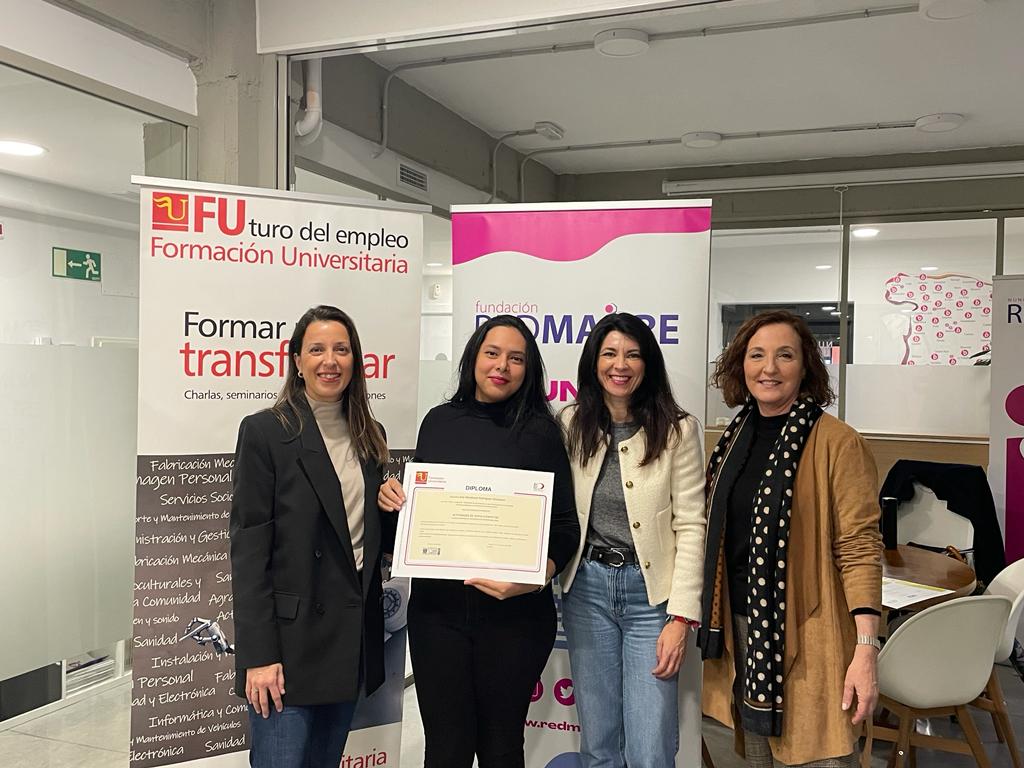 Antonia Guerrero, directora académica de Formación Universitaria, y Ana Ruiz, coordinadora de las tutoras de seguimiento visitaron nuestra sede para hacer entrega de los diplomas a las alumnas de esta 5ª Promoción de nuestro Proyecto Forma + Emplea + Integra. Les acompañaron Amaya Azcona, directora general de Fundación REDMADRE y Leticia Estevas- Guilmain, coordinadora del proyecto.