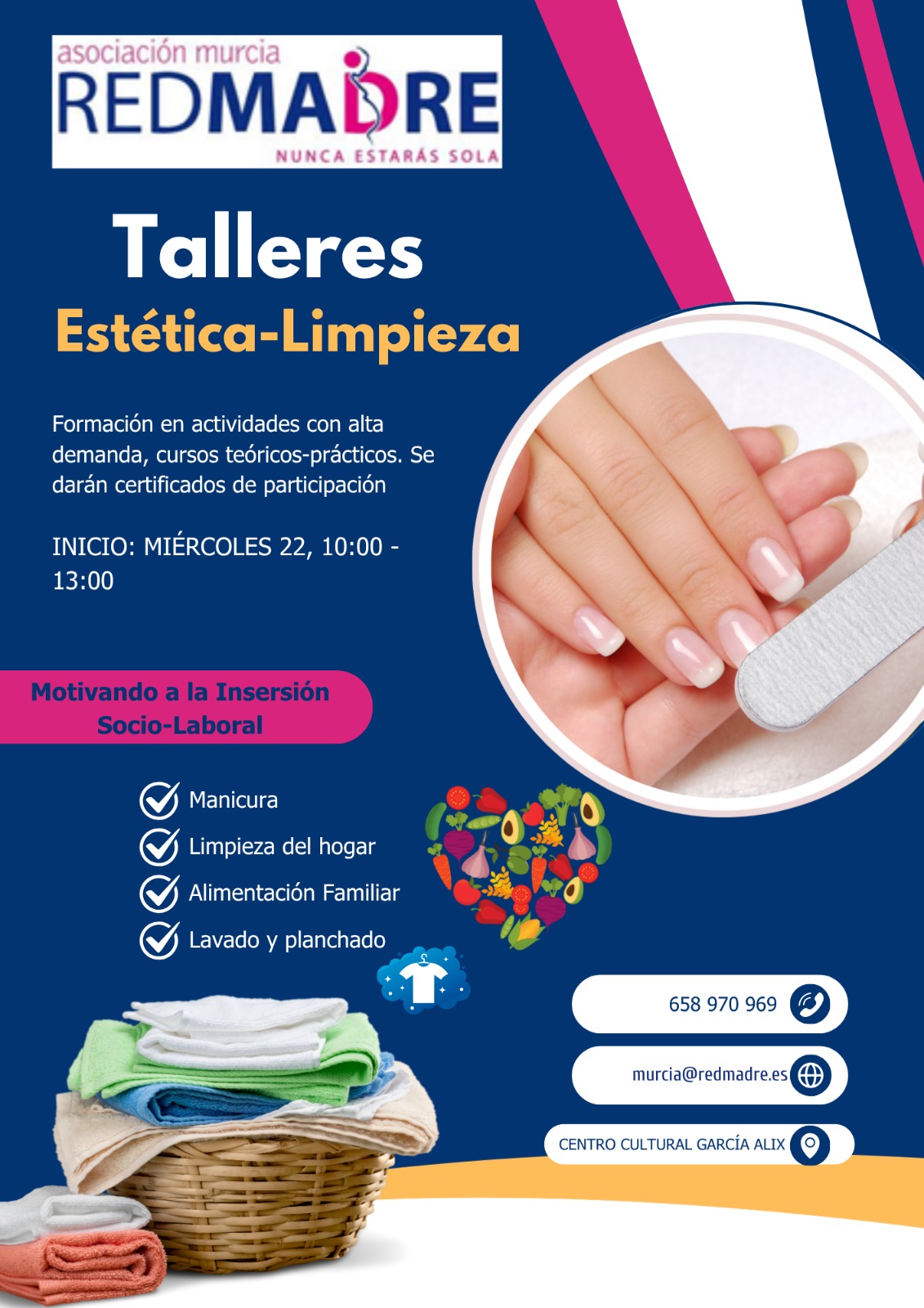 La asociación REDMADRE Murcia inaugura el curso 2025/26 con un taller de «Estética-Limpieza», que comenzará en el salón de actos del Centro Municipal García Alix de la capital murciana, el próximo miércoles día 22 de octubre, con una primera sesión entre las 10:00 y 13:00 h.