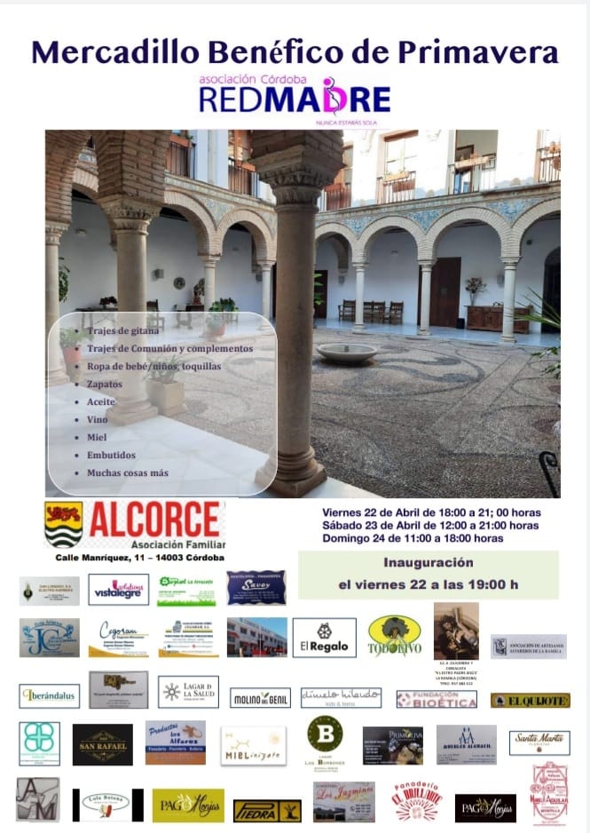 La Asociación REDMADRE Córdoba celebró del 22 al 24 de abril su Mercadillo Benéfico de Primavera en la sede de la Asociación Familiar Alcorce, una maravilla, en pleno corazón de la Judería. Gracias a todos los que pasasteis por allí y nos habéis ayudado con vuestras compras.