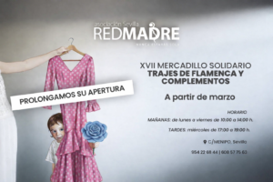 El XVII Mercadillo Solidario de Trajes de Flamenca y Complementos de REDMADRE Sevilla se celebrará nuevamente en la sede de la asociación, situada en el Polígono San Pablo. El acceso al mismo se realizará por la calle Menippo (junto al Centro Cívico) y el horario de apertura será de 11.00 a 19.00 horas los días 19, 20 y 21 de febrero y de 11.00 a 15.00 horas el domingo 22 de febrero.