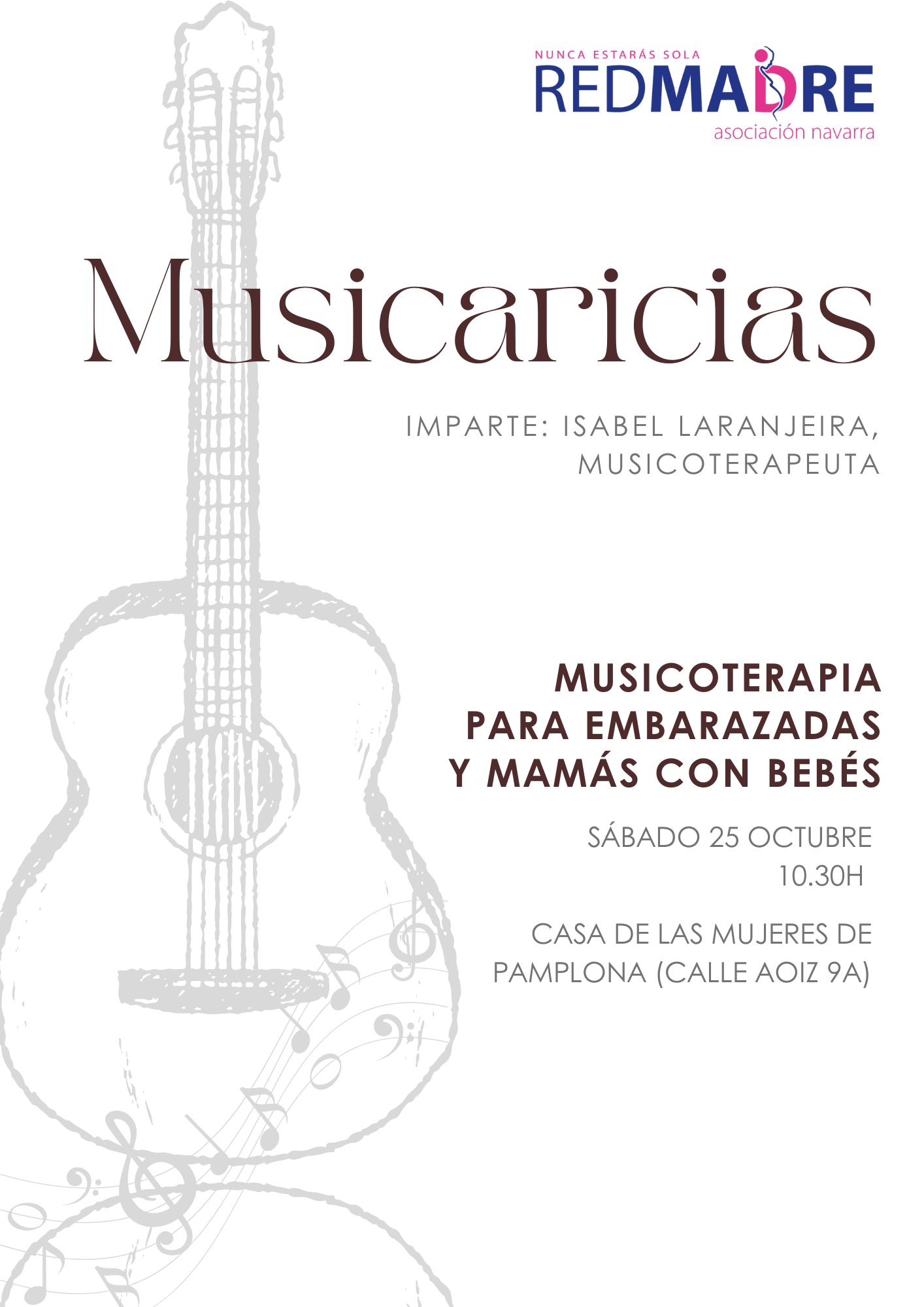 El sábado 25 de octubre tendrá lugar el taller ‘Musicaricias’, impartido por Isabel Laranjeira, musicoterapeuta. En él, trabajaremos la terapia musical con mujeres embarazadas y madres recientes, con el objetivo de utilizar la música de manera receptiva como activa para canalizar emociones debido a los cambios físicos y psíquicos durante y post-gestación.
