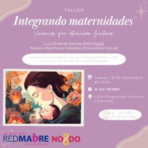 Si te interesan nuestros talleres y te gustaría asistir a alguno de ellos, no lo dudes y contacta con nosotros en los teléfonos 954 22 68 44 (de lunes a viernes, en horario de 10.00 a 14.00 horas) y 608 577 563 (24 horas) o a través de nuestro correo electrónico (sevilla@redmadre.es). Te recordamos que todos nuestros cursos y talleres tienen inscripción gratuita.