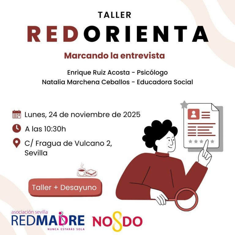 El próximo lunes 24 de noviembre, Enrique Ruiz Acosta, psicólogo de la Unidad Sanitaria de Psicología de REDMADRE Sevilla, y la educadora social, Natalia Marchena Ceballos impartirán el Taller «RedOrienta. Marcando la entrevista», quinta sesión del segundo ciclo de estos talleres dedicado a la empleabilidad, donde Enrique y Natalia seguirán abordando aspectos de la entrevista de trabajo relacionados con la marca personal de las participantes.