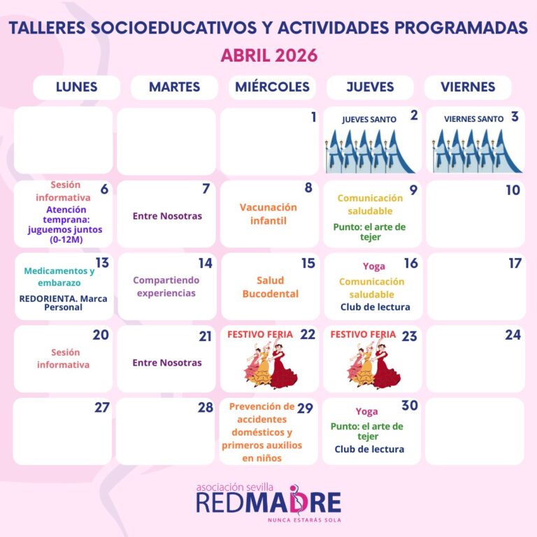 En abril continuaremos tratando en nuestro Plan de Formación 🎓 temáticas muy demandadas por nuestras usuarias y de gran utilidad para ellas como la atención temprana del bebé, la vacunación infantil, medicación apta durante el embarazo, salud bucodental, primeros auxilios y prevención de accidentes en el hogar, orientación en la búsqueda de empleo, comunicación saludable, el autocuidado a través de nuestras sesiones «Entre nosotras» o nuestras actividades de lectura, punto, yoga. Además, este mes celebraremos dos «Sesiones informativas» ℹ️ dirigidas a mujeres que han mostrado interés por formar parte de nuestro «Programa de Acompañamiento a la mujer embarazada» y a aquellas personas que quieren formar parte de nuestro voluntariado.