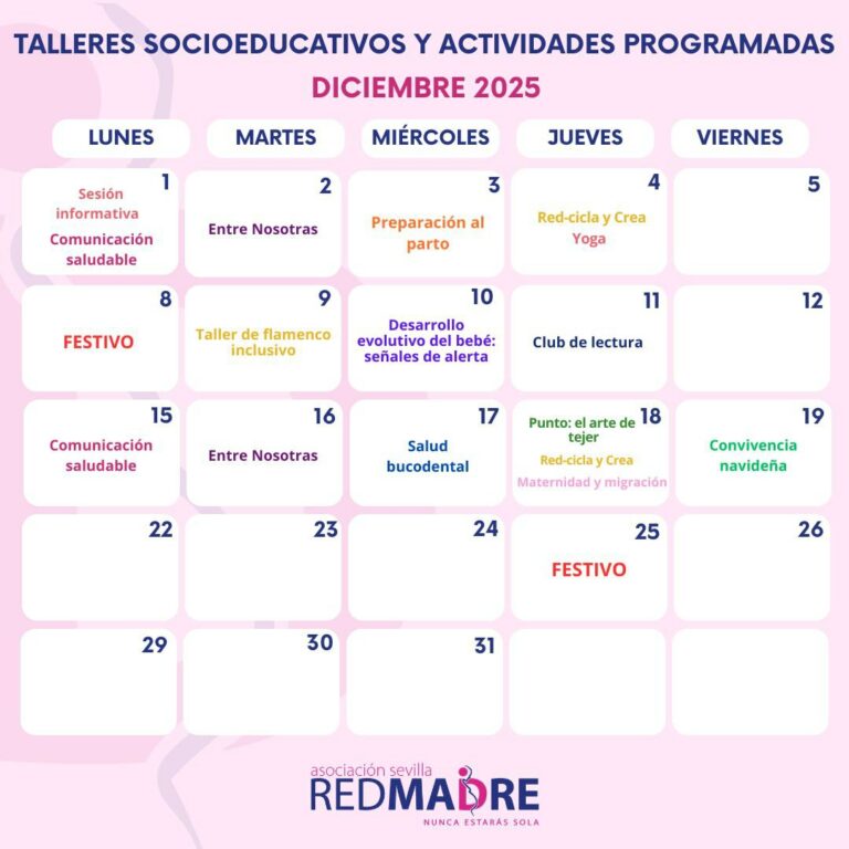 - Taller «Entre nosotras», con Luz Jiménez Santos, psicóloga perteneciente a la Unidad de Psicología de REDMADRE Sevilla.