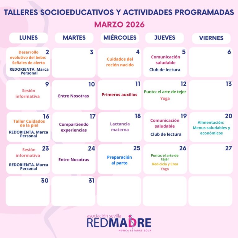 En marzo continuaremos tratando temáticas muy demandadas por nuestras usuarias y de gran utilidad para ellas, como el desarrollo evolutivo del bebé, la preparación al parto, la comunicación saludable, el autocuidado a través de las sesiones «Entre nosotras», la relajación de cuerpo y mente a través del yoga, la lectura, el punto, la costura y el reciclado creativo o jueves la marca personal en el proceso de búsqueda de empleo.