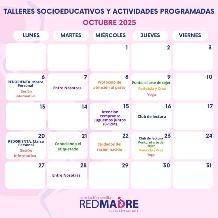 - Martes, 7 de octubre: Taller «Entre nosotras», con Luz Jiménez Santos, psicóloga perteneciente a la Unidad de Psicología de REDMADRE Sevilla.