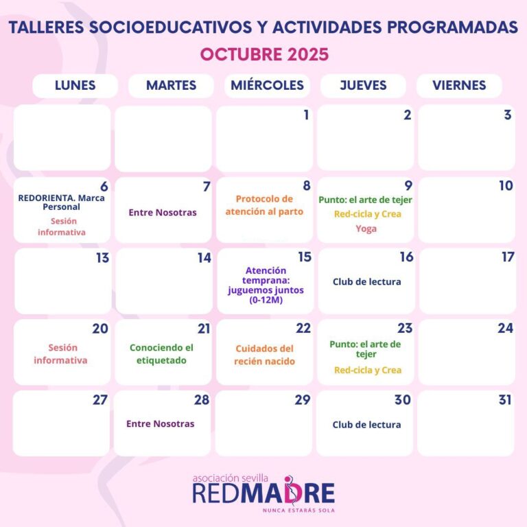 - Martes, 7 de octubre: Taller «Entre nosotras», con Luz Jiménez Santos, psicóloga perteneciente a la Unidad de Psicología de REDMADRE Sevilla.